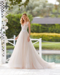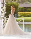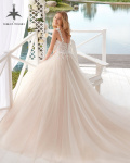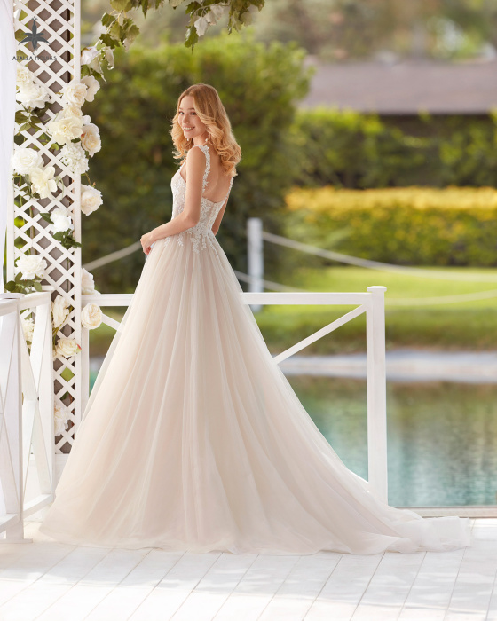 Vestido de novia ligero en tul liso, encaje y pedrería.